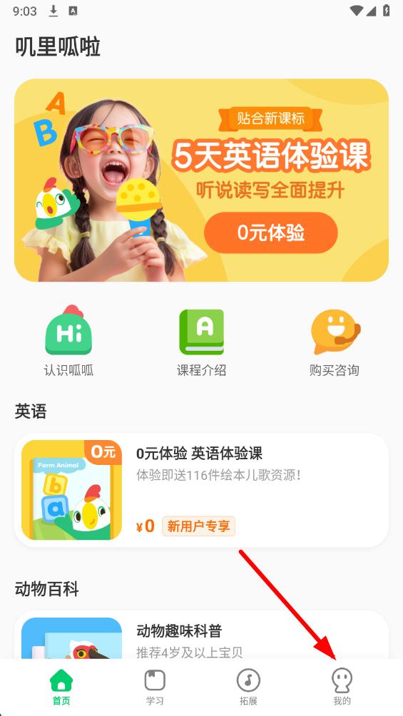 1、打開嘰里呱啦app后,在頁面底部找到并點擊我的按鈕,進入個人相關(guān)頁面。