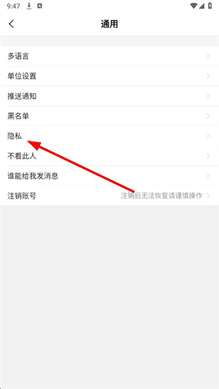 3、在通用設(shè)置頁面,點擊隱私選項,進入隱私設(shè)置頁面。