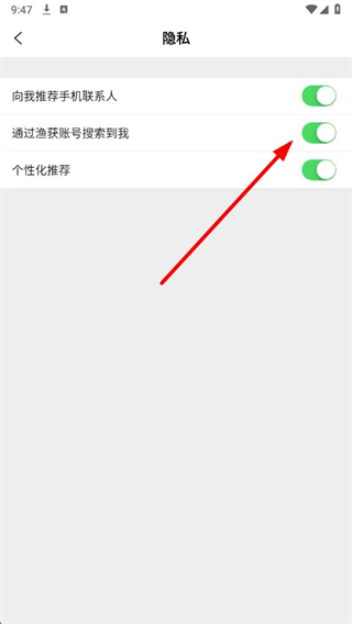 4、在隱私設(shè)置頁面,將通過漁獲賬號搜索到我選項的開關(guān)關(guān)閉,即可設(shè)置成功。