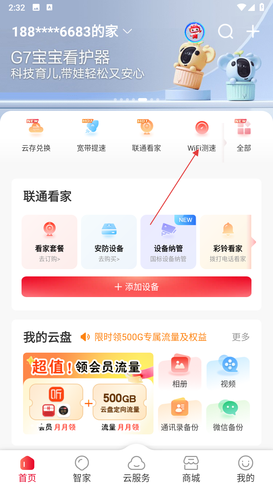 1、打開智慧沃家APP,進入首頁后點擊WiFi測速選項,進入WiFi測速頁面。