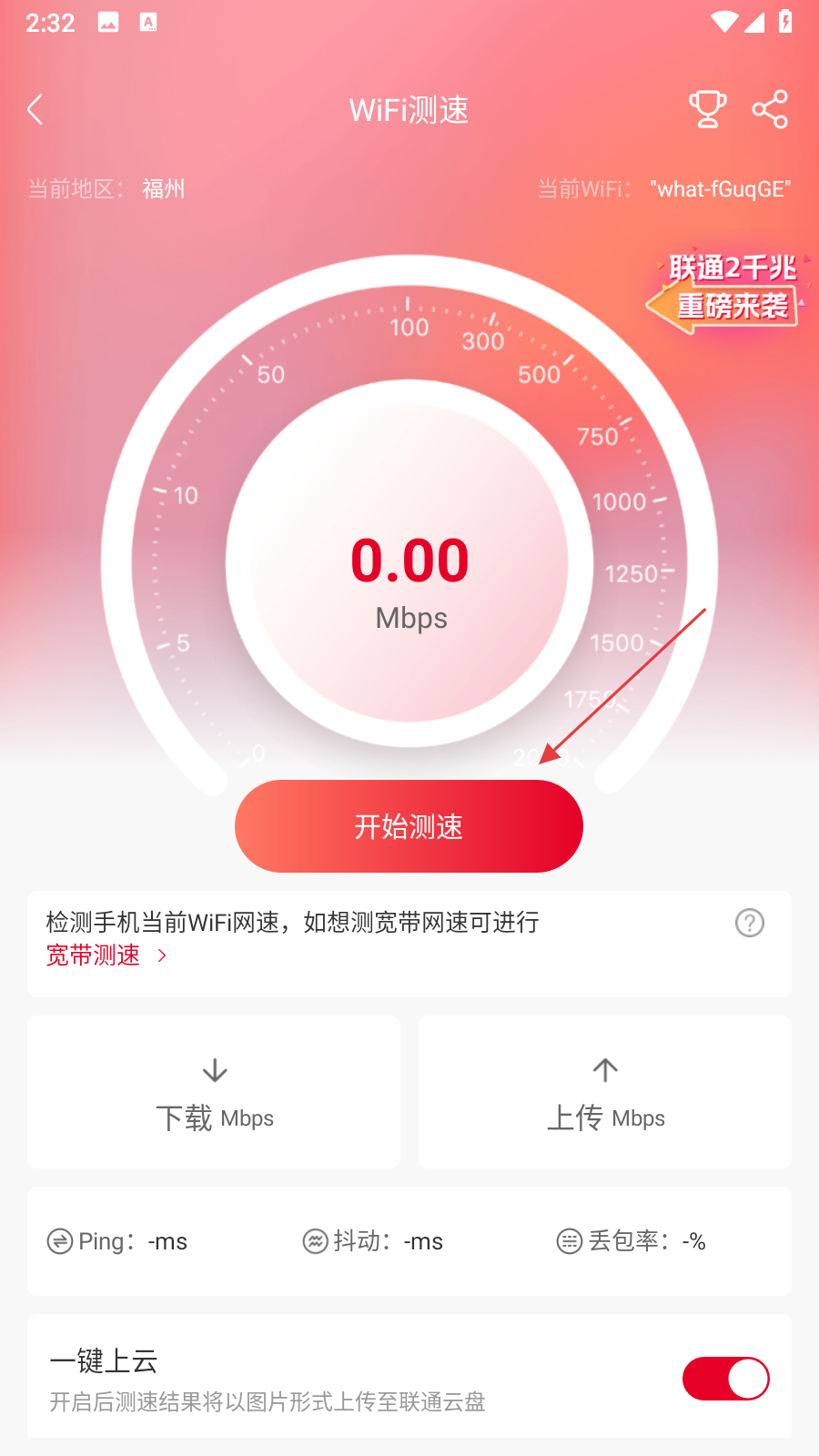 2、在WiFi測速頁面中,點擊紅色開始測速按鈕,等待測速完成。