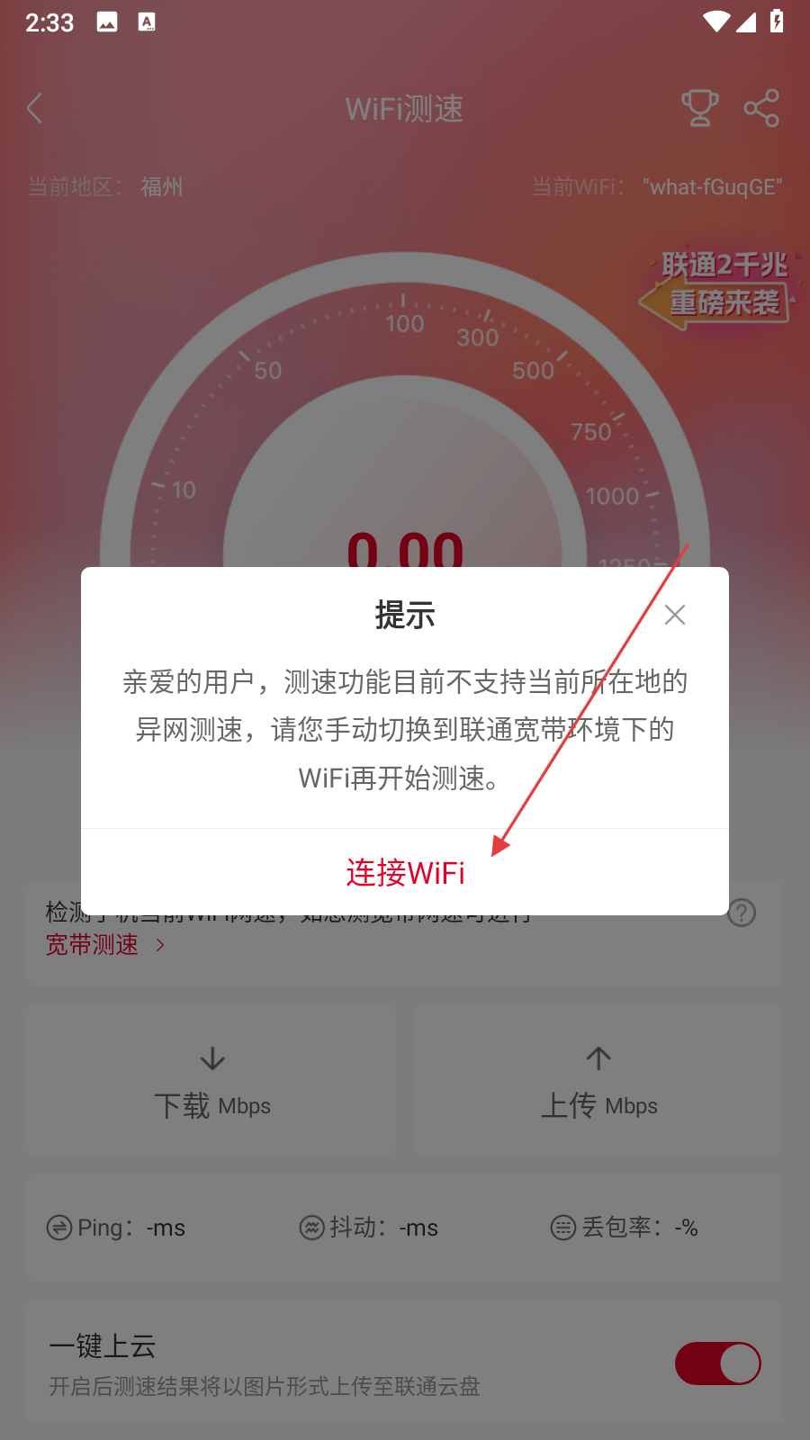 3、若彈出測速功能目前不支持當前所在地的異網(wǎng)測速提示,點擊連接WiFi按鈕,切換至聯(lián)通寬帶環(huán)境下的WiFi后,再次點擊開始測速完成網(wǎng)絡(luò)測速。