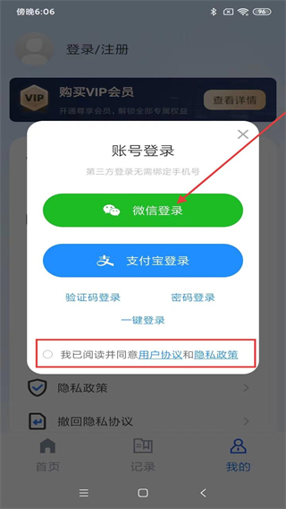 4、在彈出的賬號(hào)登錄頁(yè)面內(nèi),點(diǎn)擊微信登錄的按鈕并勾選用戶協(xié)議與隱私政策即可登錄成功。