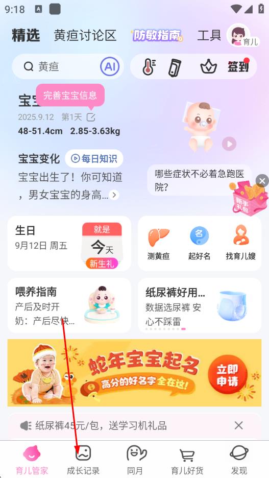 1、打開媽媽網(wǎng)孕育應(yīng)用,點(diǎn)擊底部導(dǎo)航欄中的成長記錄選項(xiàng)。