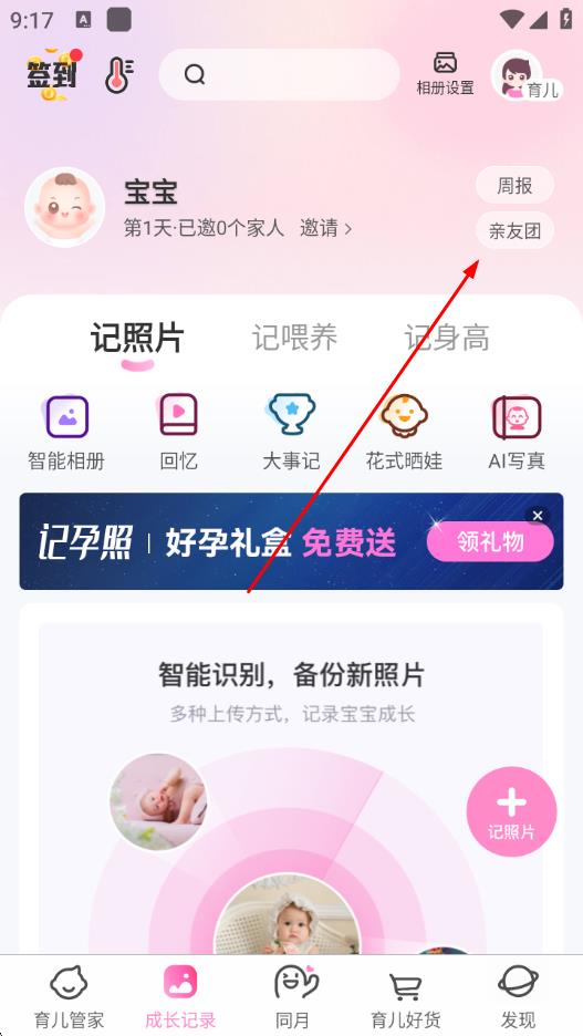 2、在“成長記錄”頁面,點(diǎn)擊右側(cè)的親友團(tuán)按鈕。