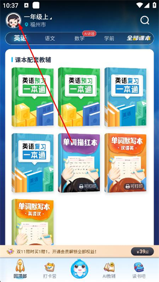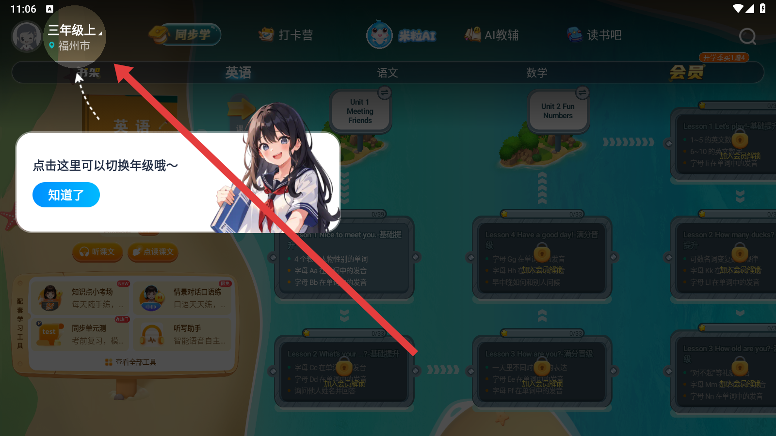 1、通過點(diǎn)擊頭像旁邊的年級(jí)區(qū)域,可以進(jìn)行切換年級(jí)。