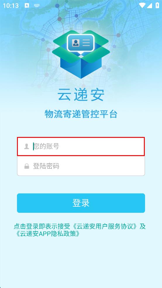 1、打開云遞安物流寄遞管控平臺(tái),在登錄界面找到“您的賬號(hào)”輸入框,點(diǎn)擊并輸入賬號(hào)。