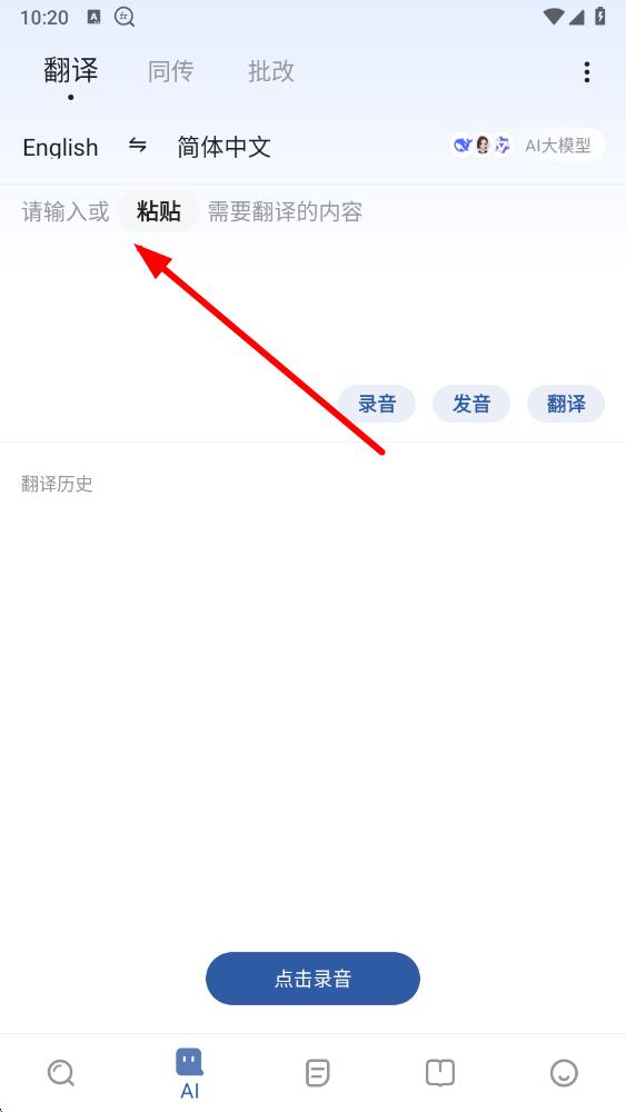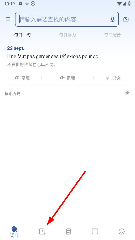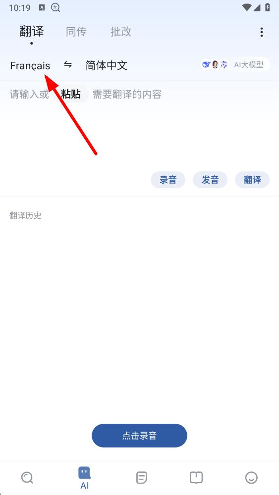 1、打開法語助手app,點擊底部導(dǎo)航欄中的圖標(biāo),進(jìn)入AI相關(guān)功能頁面。