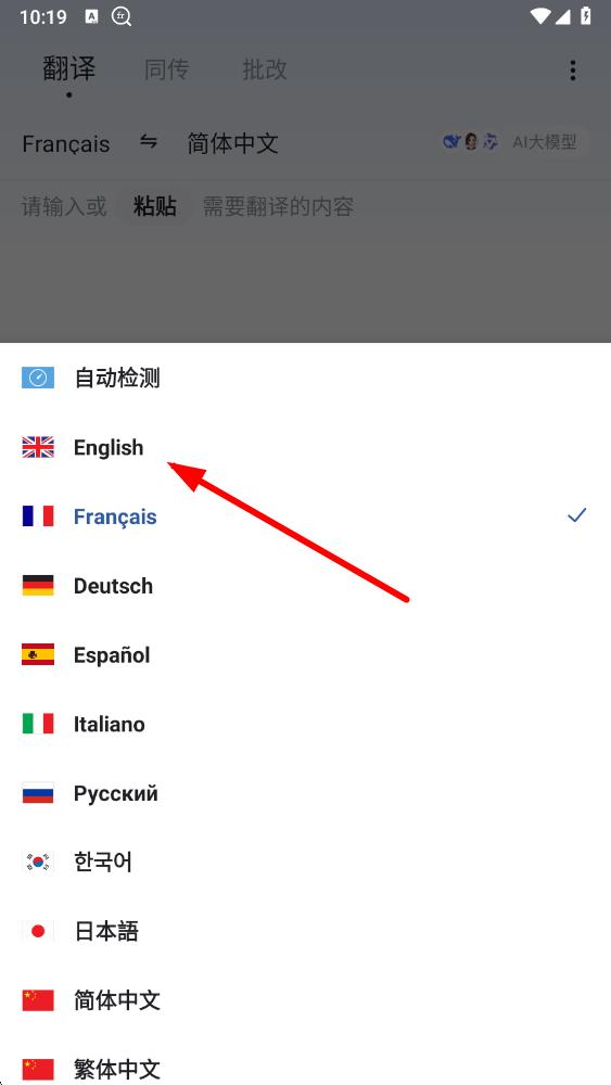 3、在彈出的語言列表中,選擇要翻譯的源語言,以英語參考。