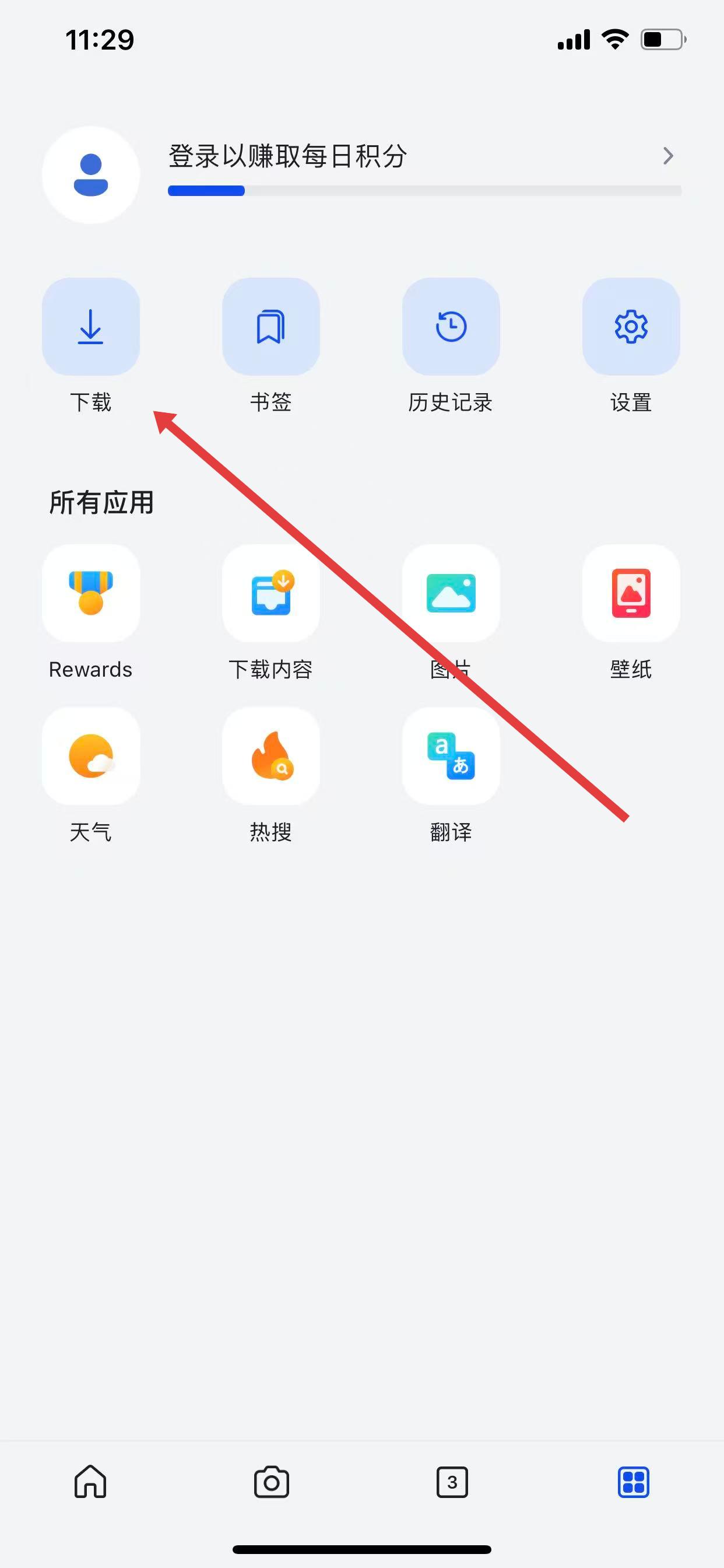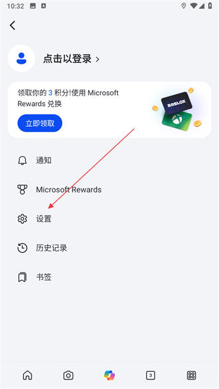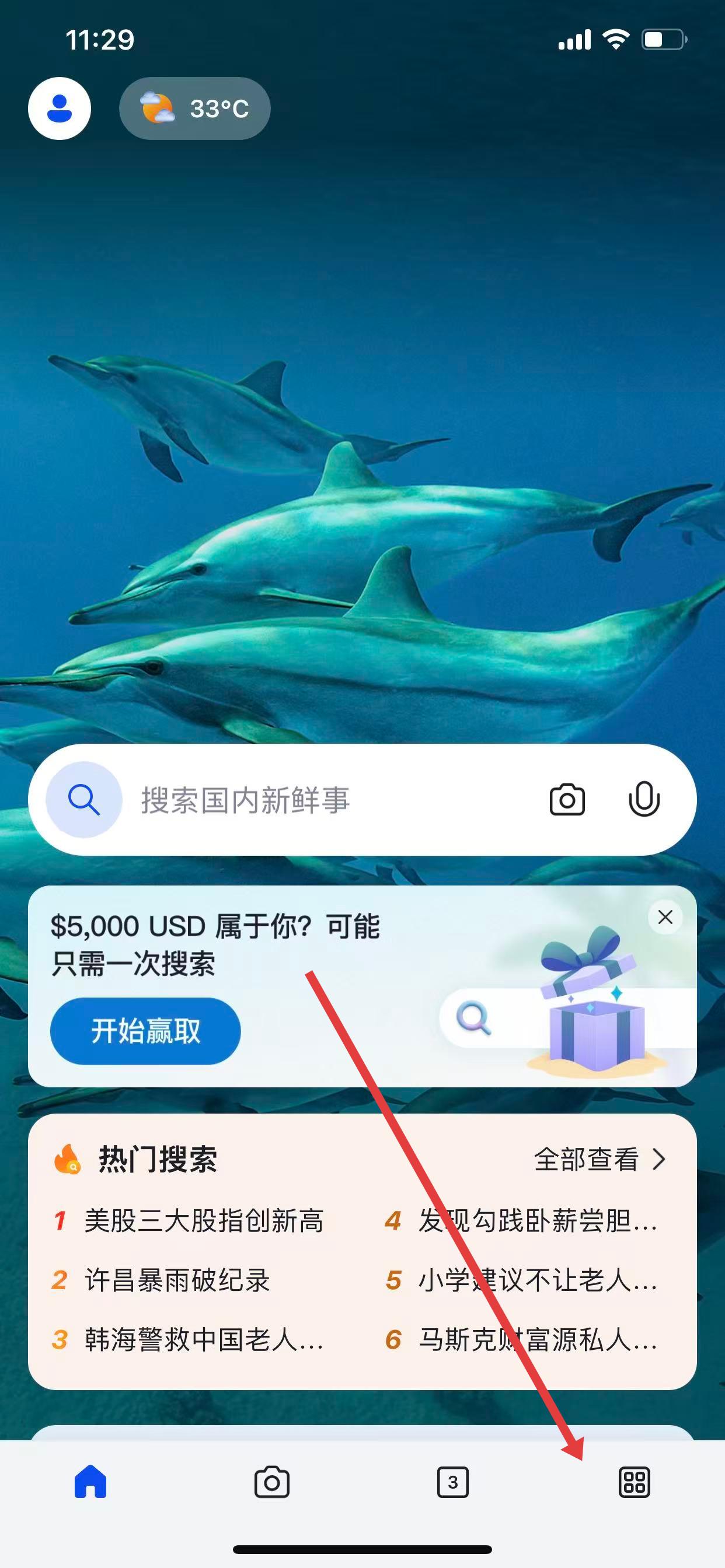 1、打開微軟必應(yīng)應(yīng)用,點擊底部導(dǎo)航欄最右側(cè)的九宮格圖標,進入功能菜單界面。