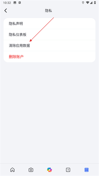 4、在隱私頁面,點擊清除應(yīng)用數(shù)據(jù)選項。