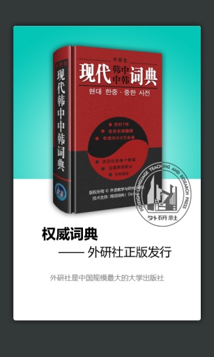 外研社現(xiàn)代韓中中韓詞典是國內(nèi)第一款由權(quán)威出版社官方發(fā)布的韓語品牌詞典,滿足了韓語學(xué)習(xí)人群對優(yōu)質(zhì)詞典的需求。優(yōu)質(zhì)的交互設(shè)計:簡潔、易用、快捷,卓越的產(chǎn)品體驗,高性能、低損耗、超穩(wěn)定。軟件無論是從應(yīng)用內(nèi)容的編排,還是內(nèi)容功能的設(shè)置,都延續(xù)了《外研社現(xiàn)代英漢漢英詞典》手機app的風(fēng)格與體驗,保證了外研社品牌形象的統(tǒng)一性。