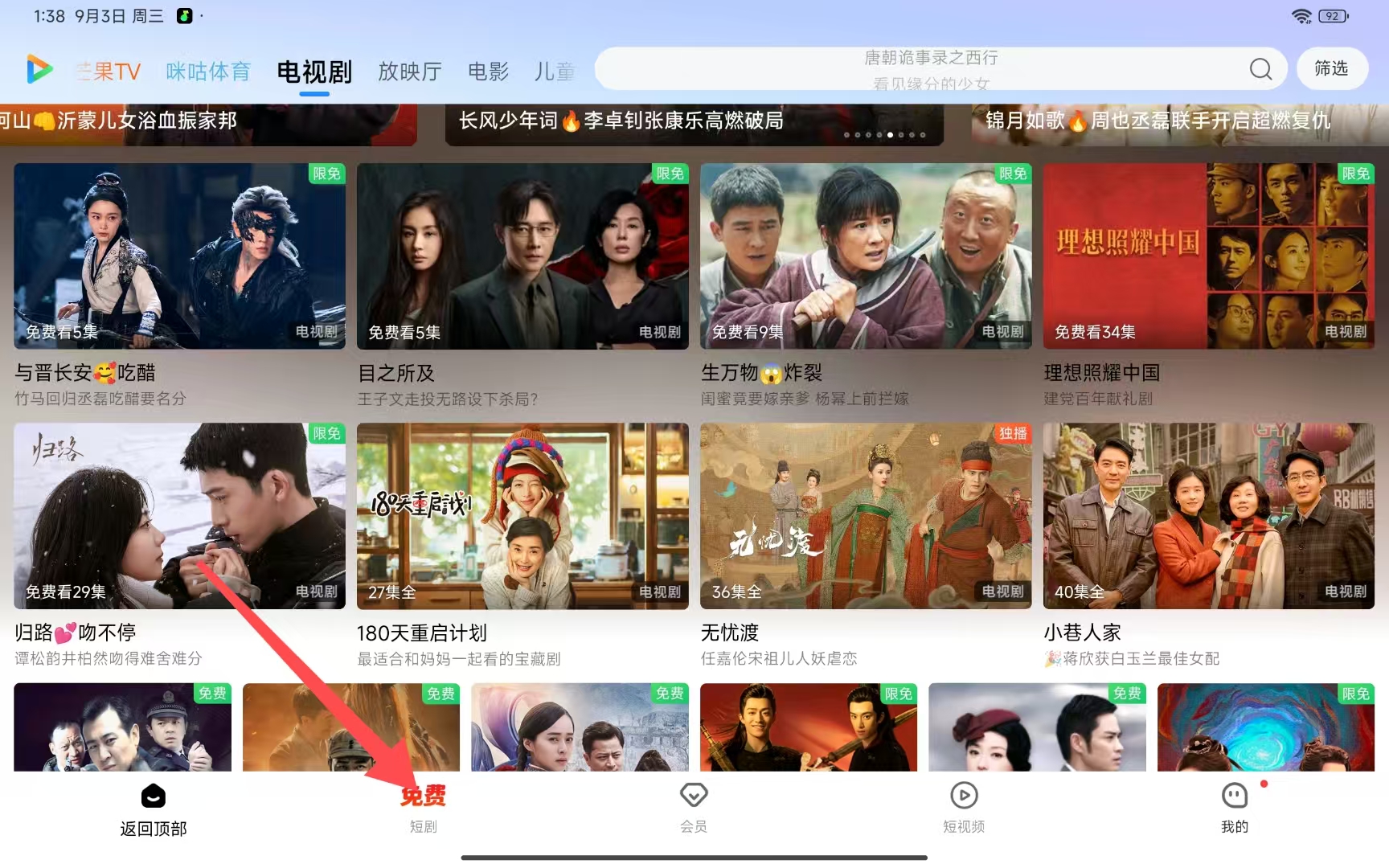 1、打開(kāi)小米視頻app,在首頁(yè)下方點(diǎn)擊免費(fèi)板塊中的短劇選項(xiàng),進(jìn)入短劇界面。