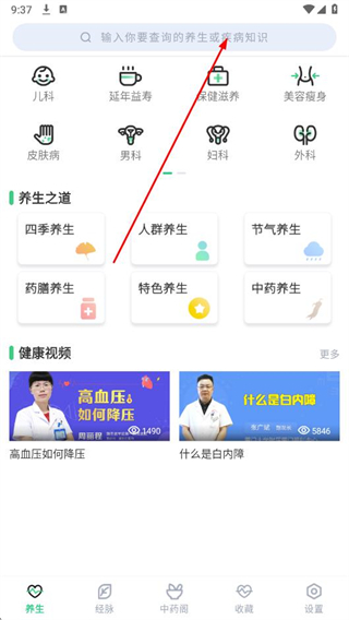 1、打開中藥大全app,在首頁上方的搜索欄中,輸入想要查詢的養(yǎng)生關(guān)鍵詞,搜索相關(guān)養(yǎng)生內(nèi)容。