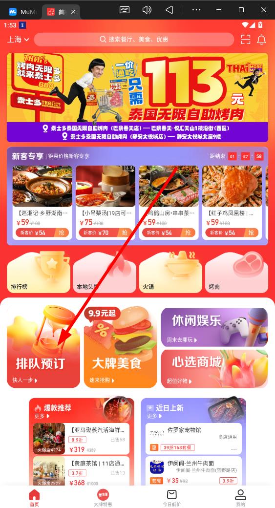 1、打開美味不用等app,在首頁點擊排隊預(yù)訂進(jìn)入排隊頁面。