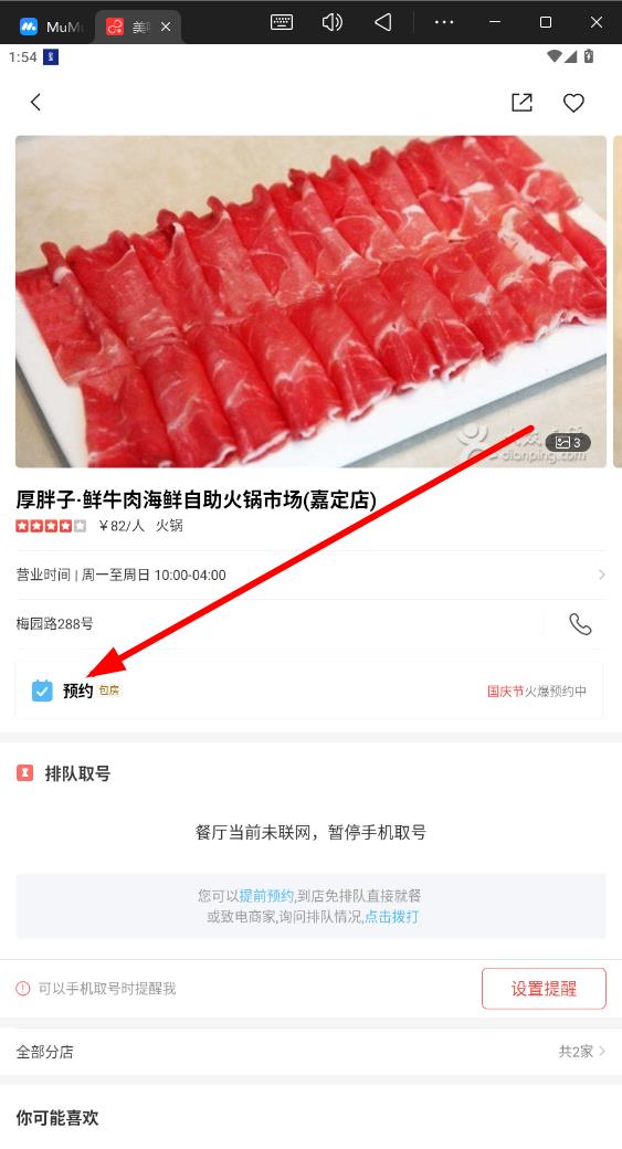 3、進(jìn)入所選餐廳頁面后,點擊預(yù)約按鈕,進(jìn)行排隊預(yù)約操作。