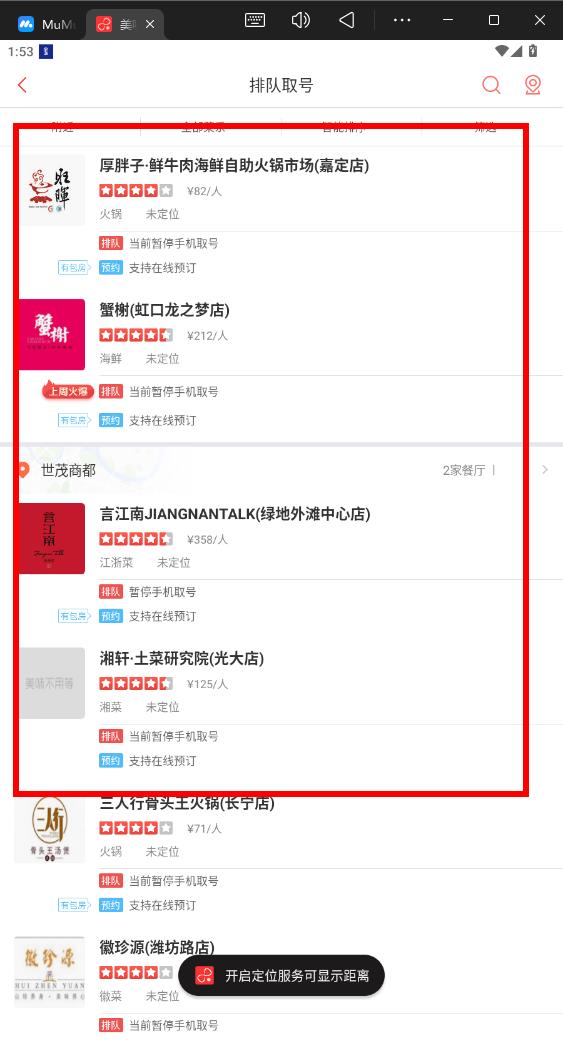 2、在排隊取號頁面瀏覽可選餐廳,選擇想去的餐廳如厚胖子·鮮牛肉海鮮自助火鍋市場(嘉定店)。