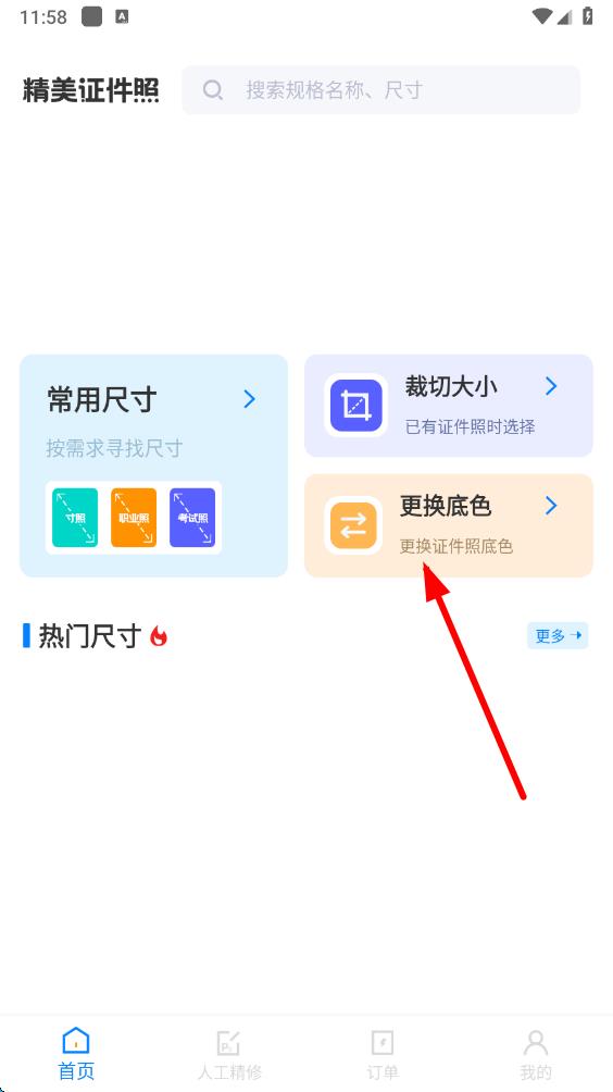 1、打開精美證件照app,在首頁點(diǎn)擊更換底色選項(xiàng),進(jìn)入換底色頁面。