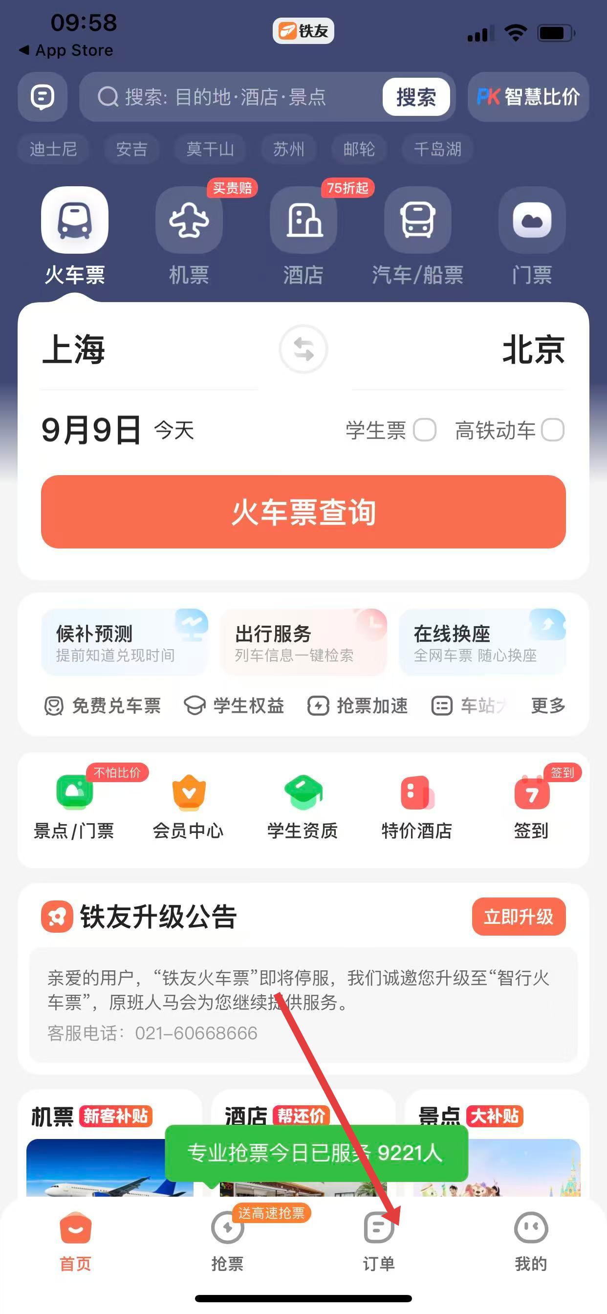 1、打開鐵友火車票App,點擊底部導航欄中的訂單選項。