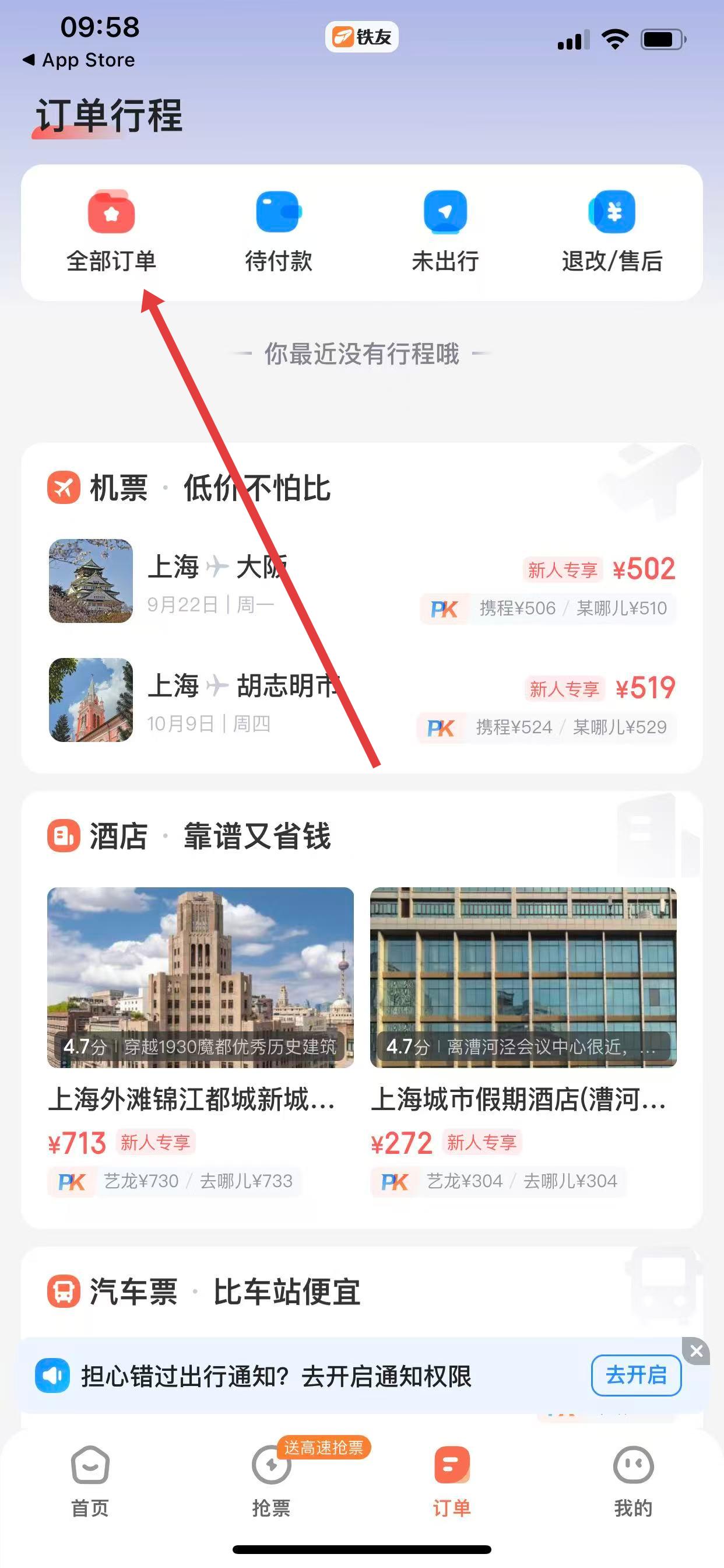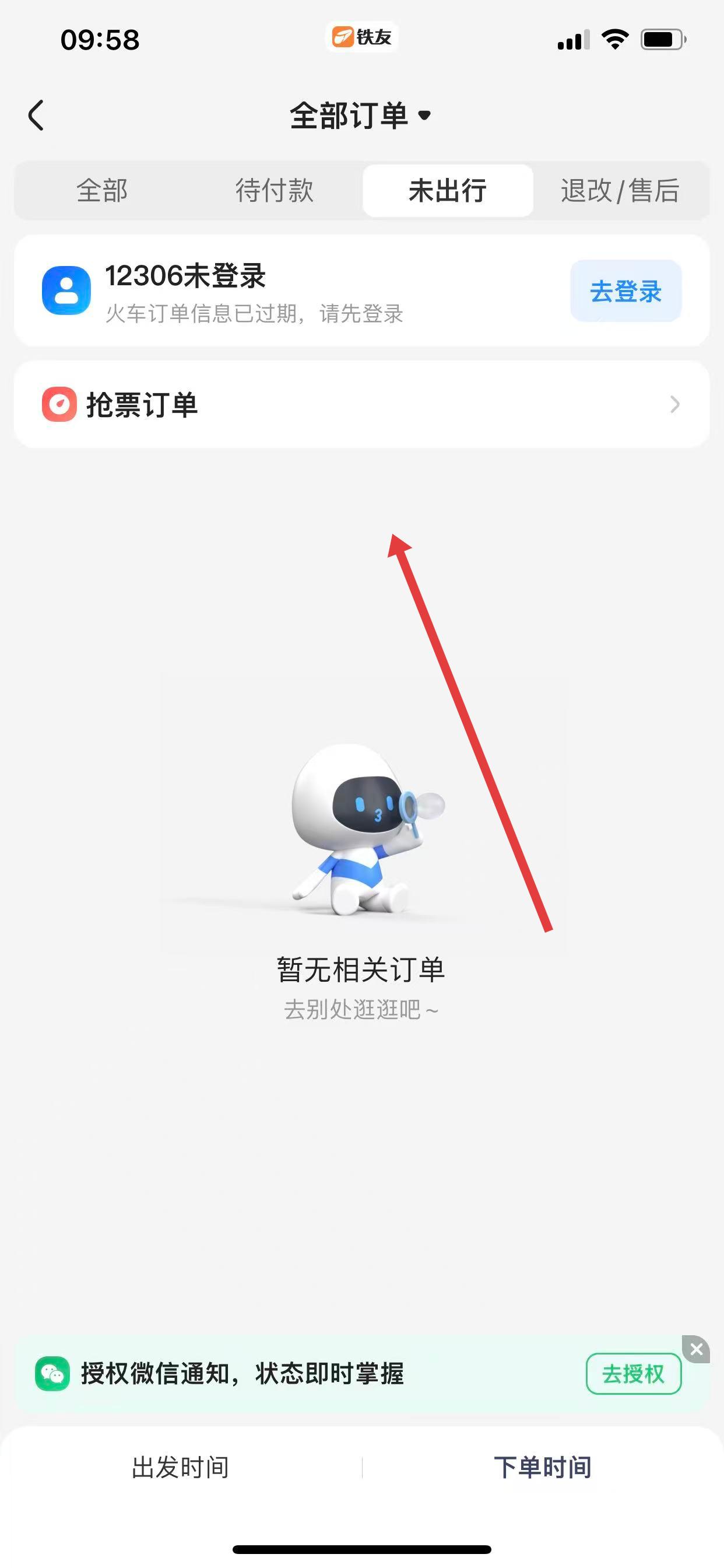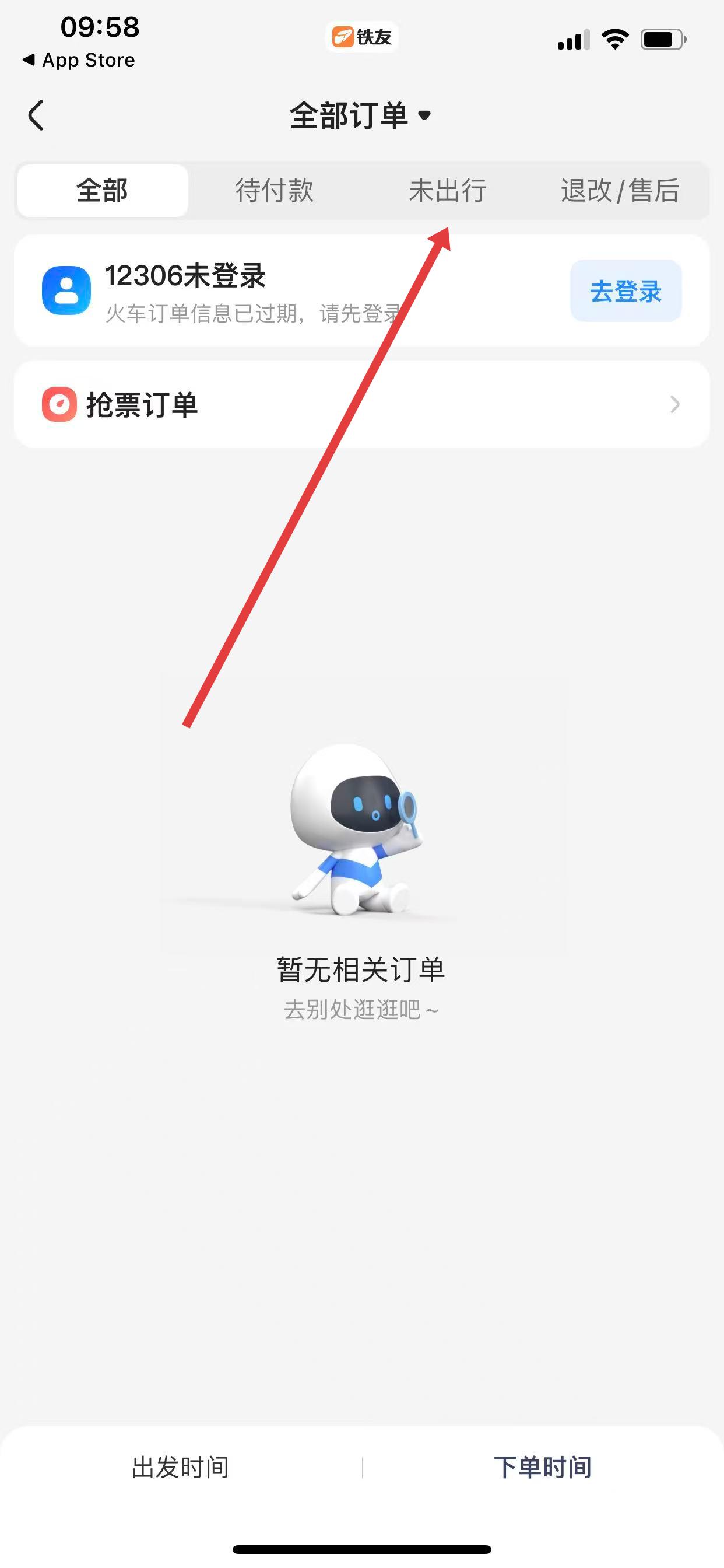3、在全部訂單頁面,可以看到不同的訂單分類標簽,點擊未出行,則可查看還未出行的訂單。