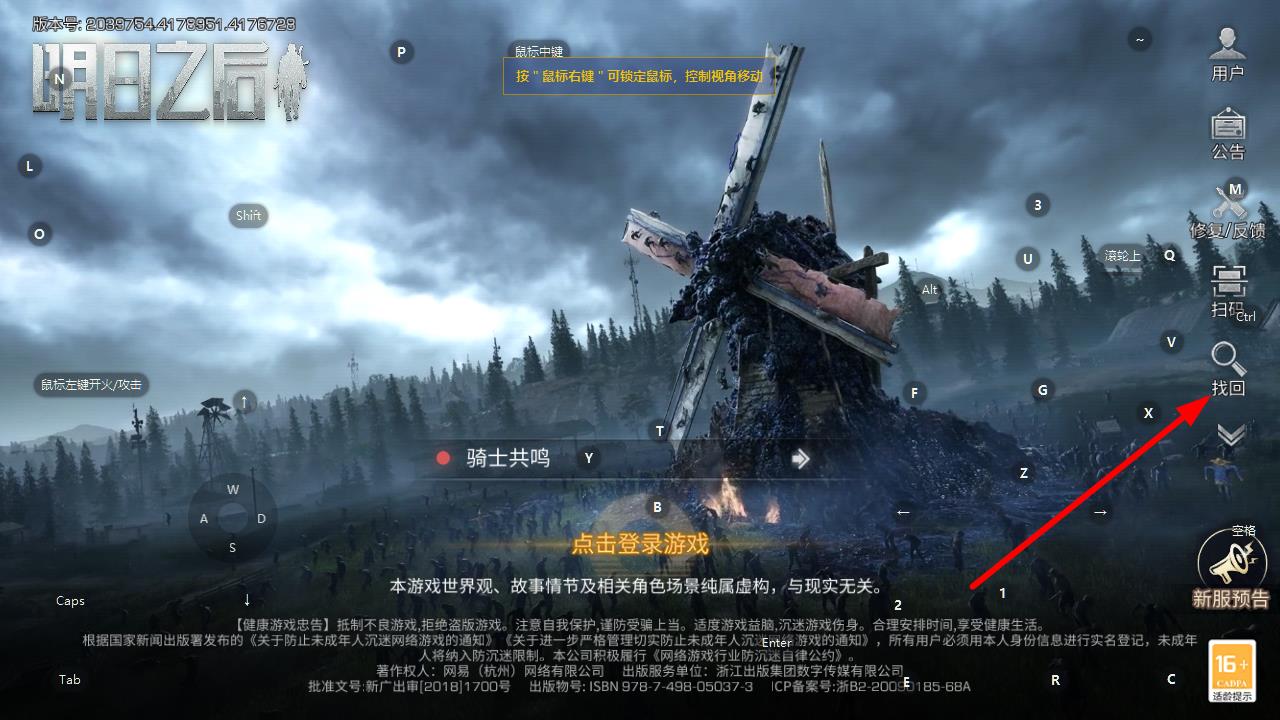 1、打開明日之后游戲登錄界面,找到界面右側(cè)的找回按鈕,如箭頭所指位置,點(diǎn)擊該按鈕進(jìn)入找回賬號相關(guān)界面。