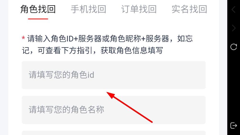 2、進(jìn)入找回界面后,選擇角色找回選項(xiàng),在該選項(xiàng)下需輸入角色I(xiàn)D和服務(wù)器或角色昵稱和服務(wù)器,以此嘗試找回角色關(guān)聯(lián)賬號。