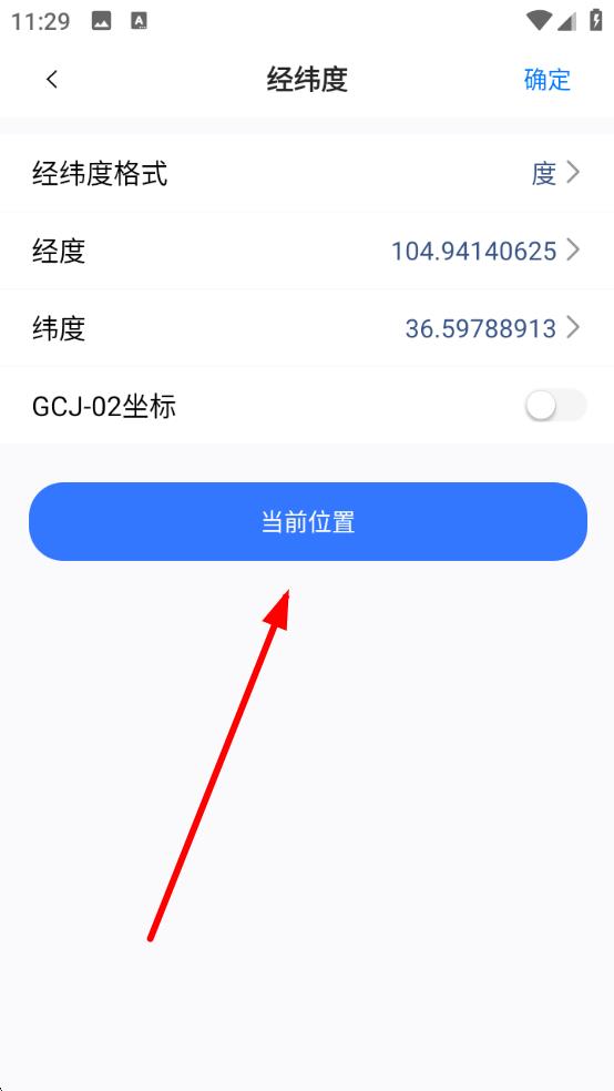 3、在經(jīng)緯度界面里,點(diǎn)擊當(dāng)前位置按鈕,即可獲取并定位當(dāng)前所在位置的坐標(biāo)。