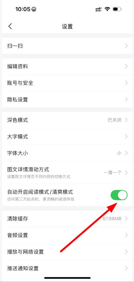 3、點(diǎn)擊自動開啟閱讀模式/清爽模式選項(xiàng)右側(cè)的開關(guān)按鈕,將其開啟即可。