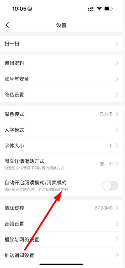 2、在設(shè)置頁面中,找到自動開啟閱讀模式/清爽模式選項(xiàng)。