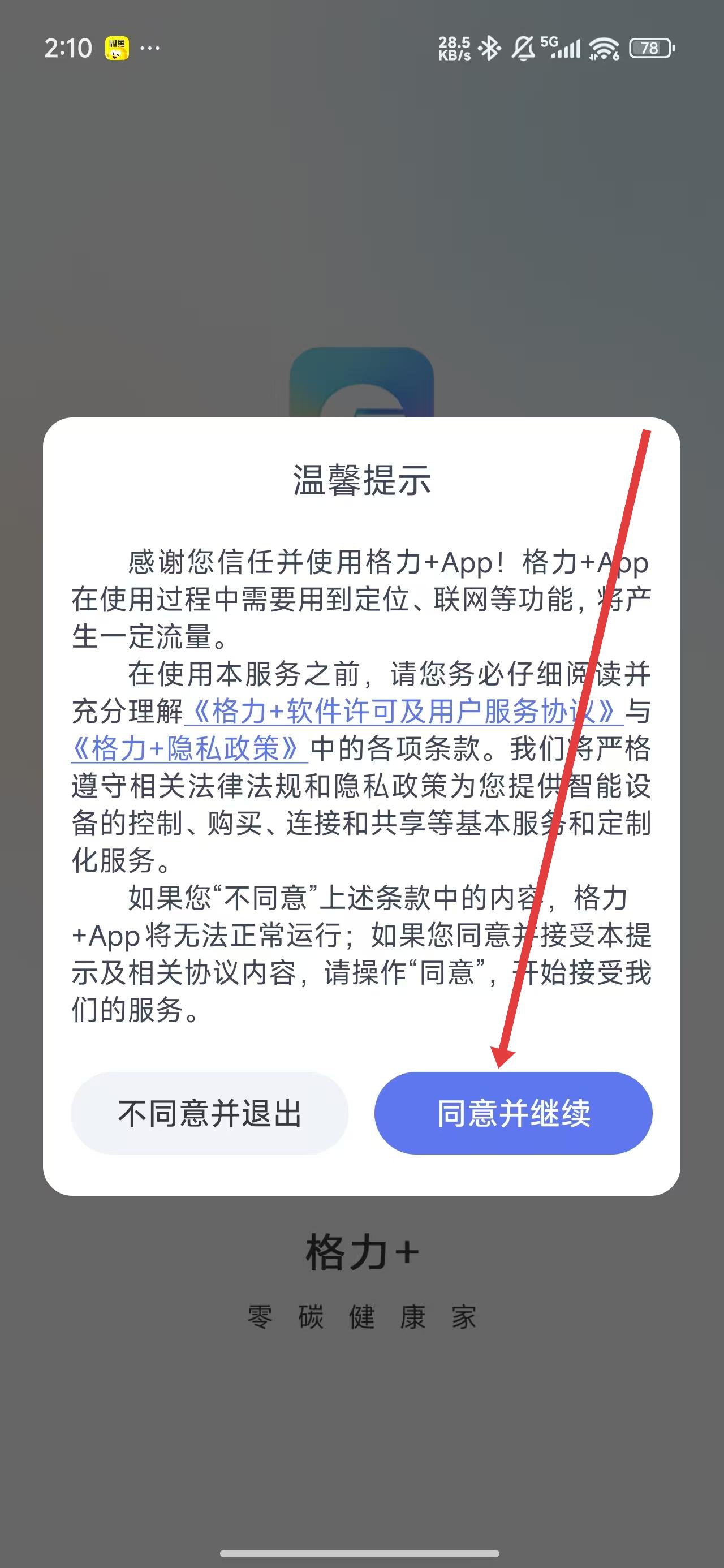 1、在打開格力app后,點擊彈窗中同意并繼續(xù)按鈕,進入使用。