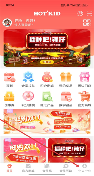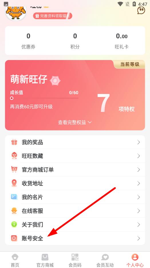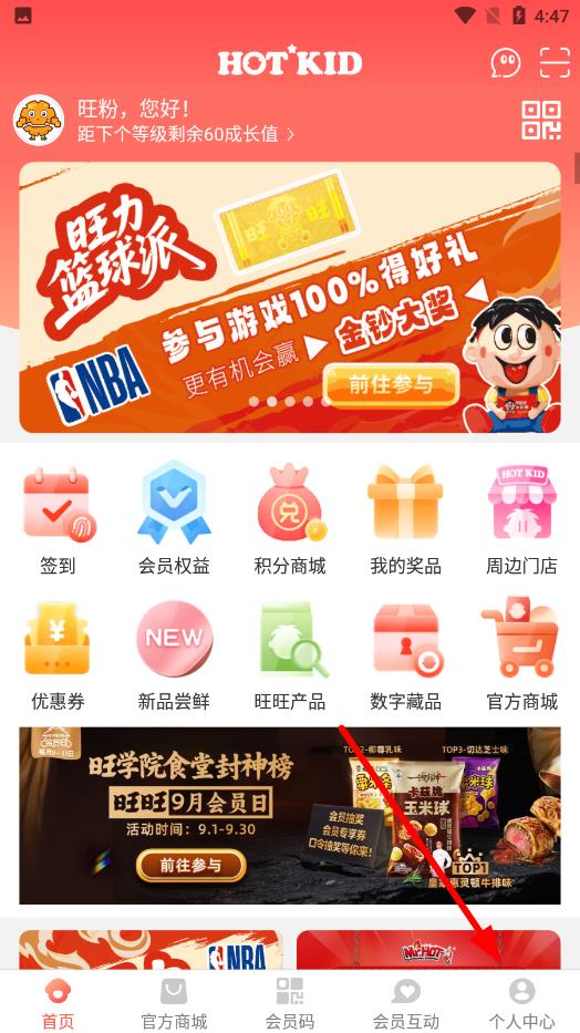 1、打開旺仔俱樂部app,進入首頁點擊底部導(dǎo)航欄最右側(cè)的個人中心選項,進入個人相關(guān)操作頁面。