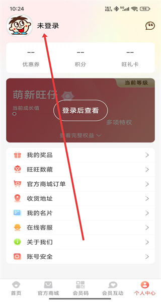 3、在個人中心頁面點擊“未登錄”,進入登錄界面。