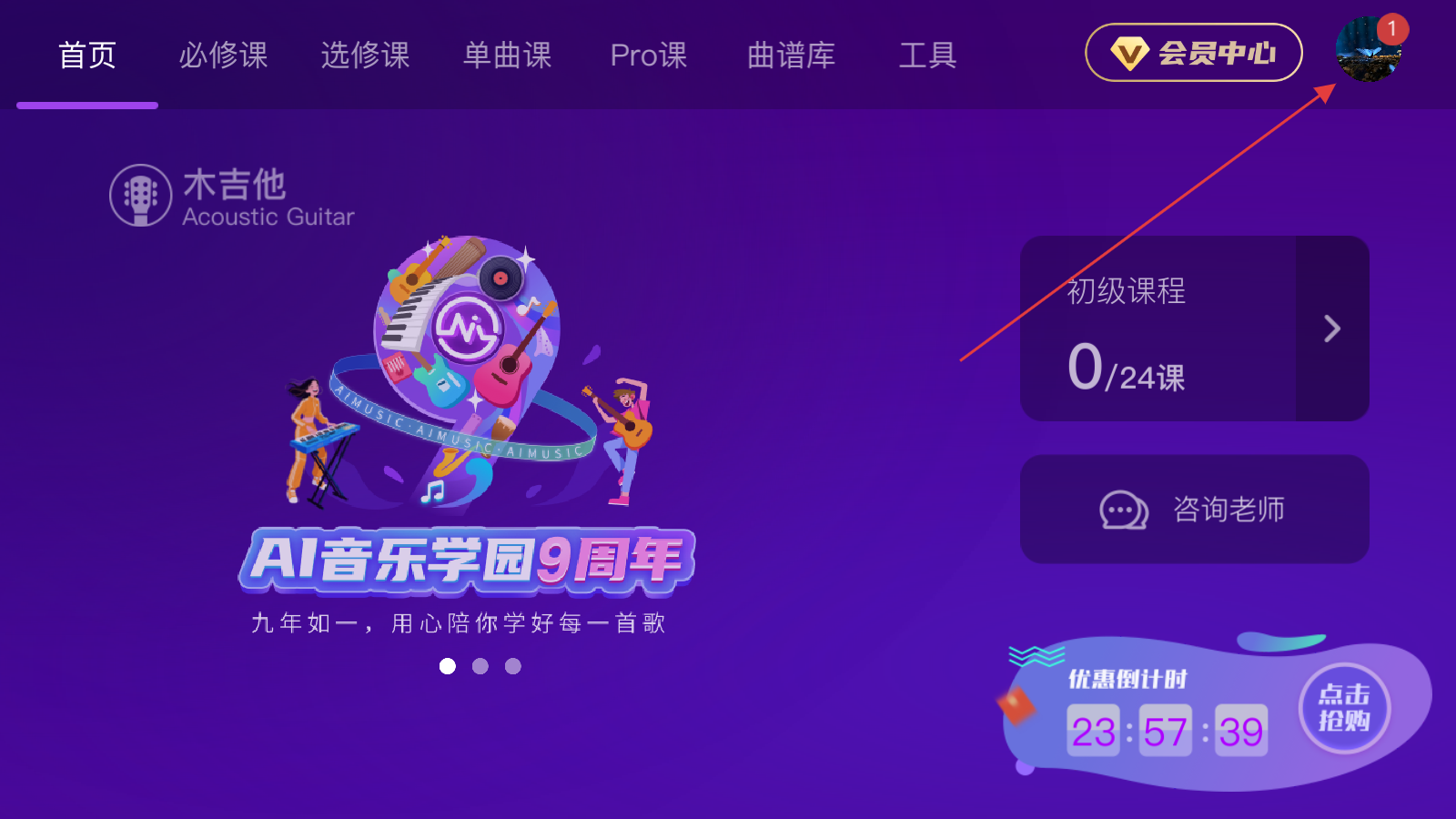 1、打開AI音樂學(xué)園APP,在首頁點(diǎn)擊右上角的個人頭像,進(jìn)入個人中心頁面。