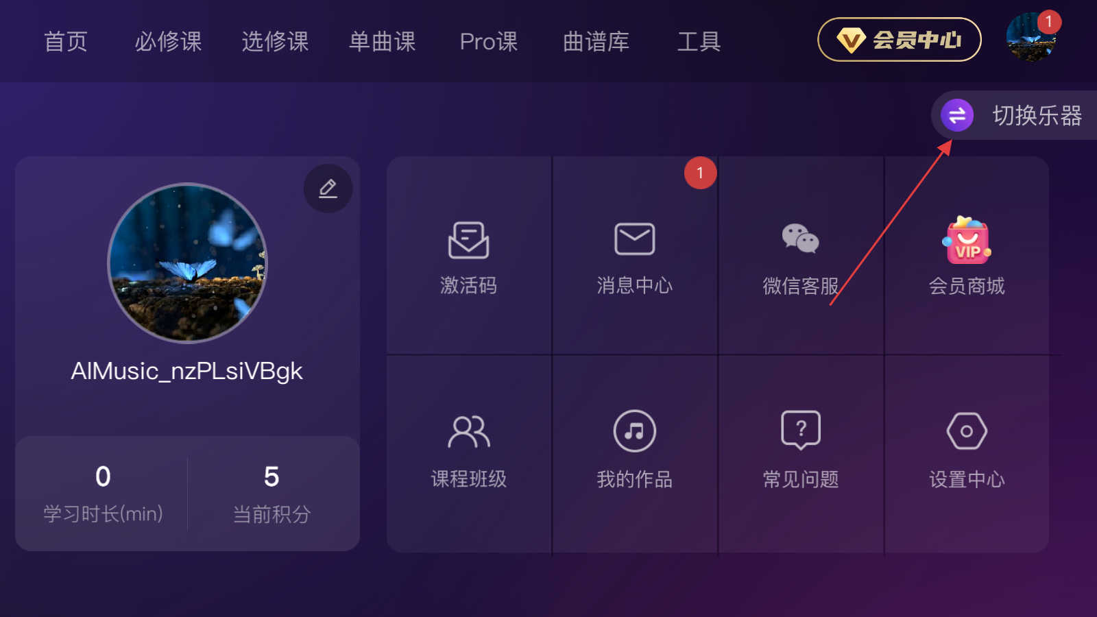 2、在個人中心頁面,點(diǎn)擊切換樂器按鈕,進(jìn)入樂器選擇界面。