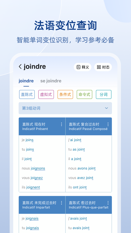 - 法語動詞變位查詢,提供18種時態(tài)的動詞變位反查功能;
