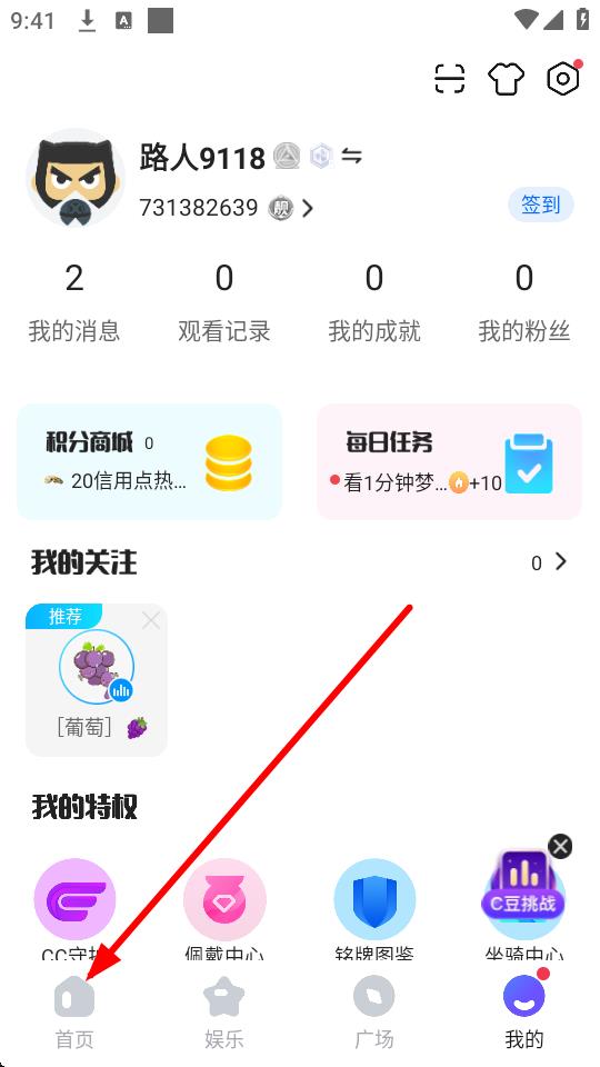 1、打開CC直播應用,點擊底部導航欄中的首頁選項,進入首頁界面。