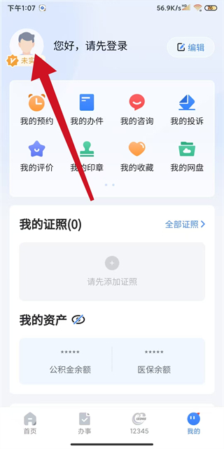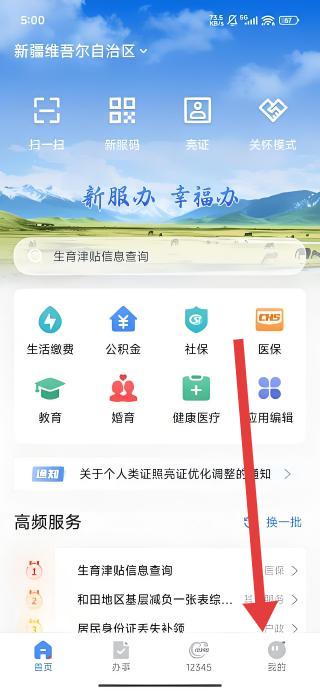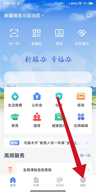 2、在新服辦APP首頁(yè),可以按照箭頭指引方向點(diǎn)擊底部我的圖標(biāo),進(jìn)入個(gè)人中心頁(yè)面。
