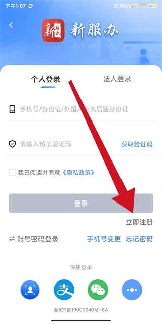 3、在個(gè)人登錄頁(yè)面點(diǎn)擊立即注冊(cè)選項(xiàng),進(jìn)入個(gè)人注冊(cè)頁(yè)面。