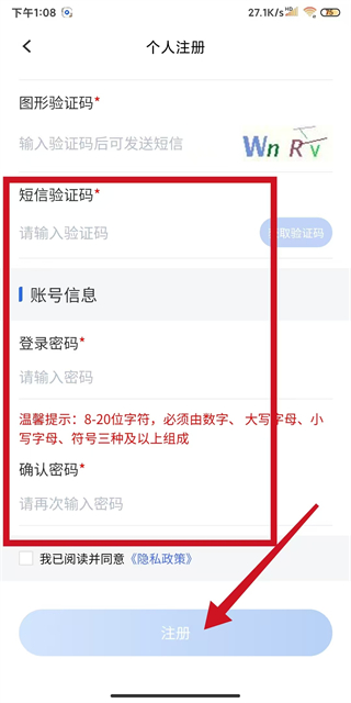 4、在個(gè)人注冊(cè)頁(yè)面填入信息,勾選同意隱私政策,點(diǎn)擊注冊(cè)按鈕,即可完成新服辦賬號(hào)注冊(cè)。