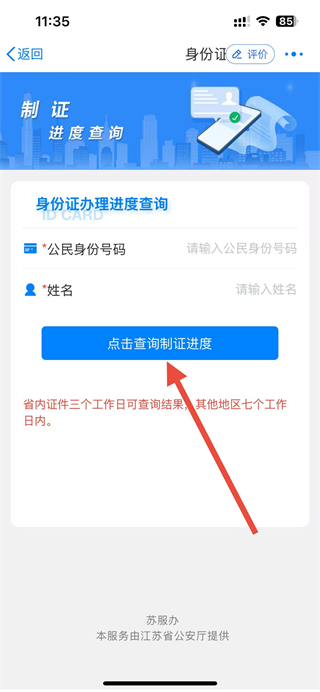 4、在頁面,輸入信息后,點擊查詢制證進度,即可查詢身份證辦理進度。