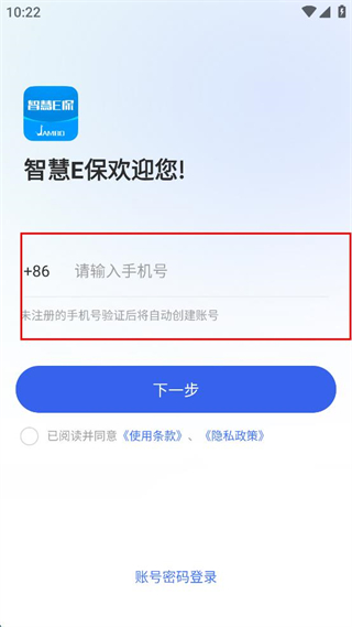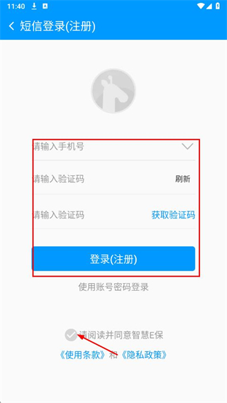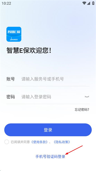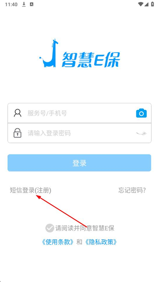 1、打開(kāi)智慧E保APP,在登錄界面點(diǎn)擊短信登錄選項(xiàng),勾選請(qǐng)閱讀并同意智慧E保使用條款和隱私私政策。
