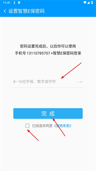 3、若注冊(cè)過(guò)程中需要設(shè)置智慧E保密碼,設(shè)置密碼,勾選已閱讀并同意使用條款,點(diǎn)擊完成即可完成注冊(cè)。
