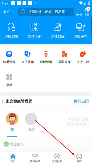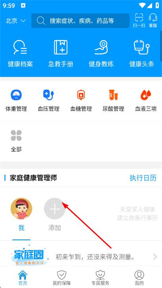 1、打開(kāi)智慧E保APP,在首頁(yè)家庭健康管理師板塊點(diǎn)擊添加,進(jìn)入添加家人頁(yè)面。
