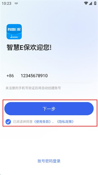 2、輸入手機(jī)號(hào),勾選同意使用條款和隱私政策,點(diǎn)擊下一步。
