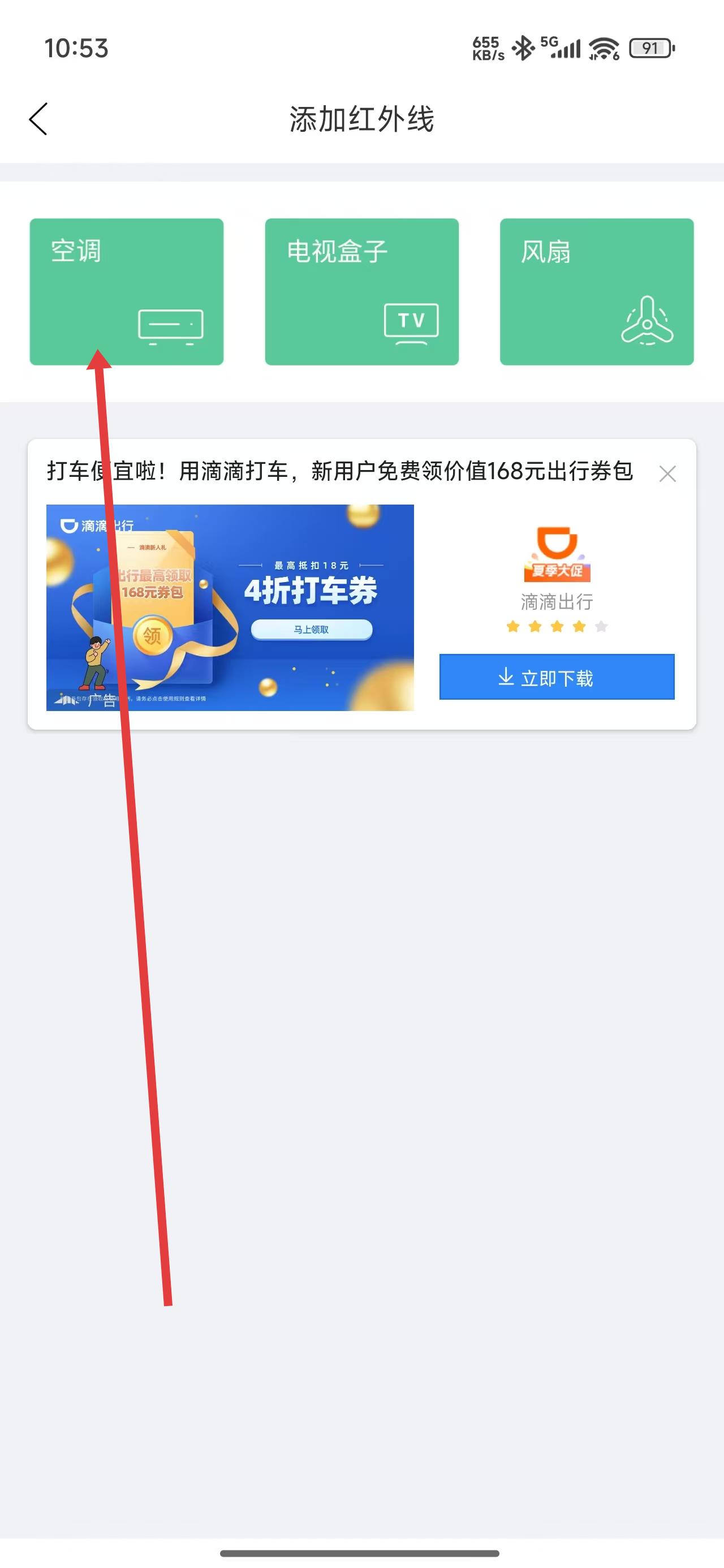 2、在添加紅外線頁(yè)面,點(diǎn)擊空調(diào)圖標(biāo)區(qū)域添加空調(diào)紅外線。