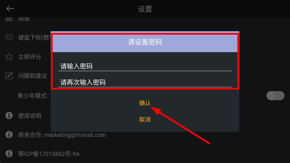 4、彈出密碼設(shè)置窗口后,輸入并再次確認設(shè)置密碼,點擊確認,即可成功開啟青少年模式。