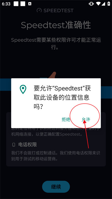 2、隨后,這里在檢測網(wǎng)速的過程中需要獲取一些權(quán)限,點(diǎn)擊【允許】,如下圖;