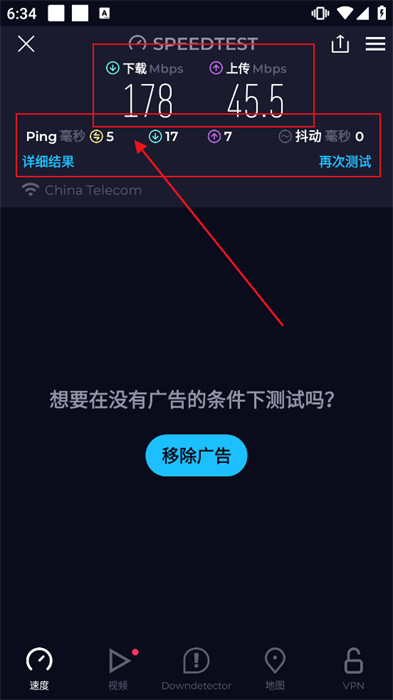 4、只需要短時(shí)間的等待即可看到測算的結(jié)果,包含了文件上傳和下載的速度,十分的直觀。
