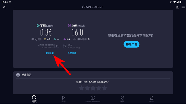 3、點(diǎn)擊詳細(xì)結(jié)果選項(xiàng),可查看更具體的測速結(jié)果,包括歷史測試結(jié)果等。
