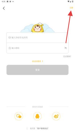 2、進(jìn)入到登錄的頁面內(nèi),點(diǎn)擊右上角注冊的按鈕。